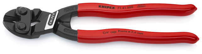 71 41 200 SB KNIPEX CoBolt® S presnými reznými hranami pre mäkký, tvrdý a pružinový drôt. Reže skrutky, klince, nity a pod. do 5,2 mm priem.. Efektívny dizajn kĺbu zaisťuje výnimočný rezný výkon s minimom námahy. S výklenkom pre ľahšie rezanie hrubších káblov. Rezné hrany dodatočne indukčne kalené; tvrdosť reznej hrany pribl. 64 HRC. Hlava zahnutá v uhle 20° s kĺbovou tyčou na jednej strane a bočný brit pre takmer hladké strihanie; s priestorom na uchopenie. - Kapacity strihania mäkkého drôtu (priemer): Ø 6mm - Kapacity strihania stredne tvrdého drôtu (priemer): Ø 5,2mm - Kapacity strihania mäkkého drôtu (priemer): Ø 4,0mm - Kapacity strihania pružinového drôtu (priemer): Ø 3,6mm