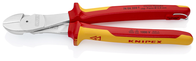 74 06 250 T BK Bočné cvikacie kliešte s veľkou pákovou silou Na veľmi drsné, nepretržité používanie. Vysoký rezný výkon s minimálnou námahou vďaka optimálnej koordinácii uhla rezného noža a prevodového pomeru. Presné rezné hrany dodatočne indukčne kalené (tvrdosť reznej hrany pribl. 64 HRC), pre všetky druhy drôtu vrátane pružinového drôtu. Kliešte s integrovaným, izolovaným závesným okom na pripevnenie zaisťovacieho systému. - Kapacity strihania stredne tvrdého drôtu (priemer): Ø 4,6mm - Kapacity strihania mäkkého drôtu (priemer): Ø 3,5mm - Kapacity strihania pružinového drôtu (priemer): Ø 3,0mm - : - :