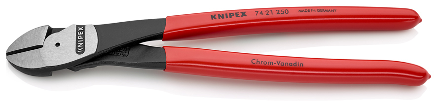 74 21 250 Bočné cvikacie kliešte s veľkou pákovou silou Na veľmi drsné, nepretržité používanie. Vysoký rezný výkon s minimálnou námahou vďaka optimálnej koordinácii uhla rezného noža a prevodového pomeru. Presné rezné hrany dodatočne indukčne kalené (tvrdosť reznej hrany pribl. 64 HRC), pre všetky druhy drôtu vrátane pružinového drôtu. 250 mm dlhé bočné cvikacie kliešte sú vhodné pre medené vodiče do 16 mm² a hliníkové vodiče do 35 mm². Hlava zahnutá v uhle 12° poskytuje priestor na uchopenie. - Kapacity strihania stredne tvrdého drôtu (priemer): Ø 4,6mm - Kapacity strihania mäkkého drôtu (priemer): Ø 3,5mm - Kapacity strihania pružinového drôtu (priemer): Ø 3,0mm