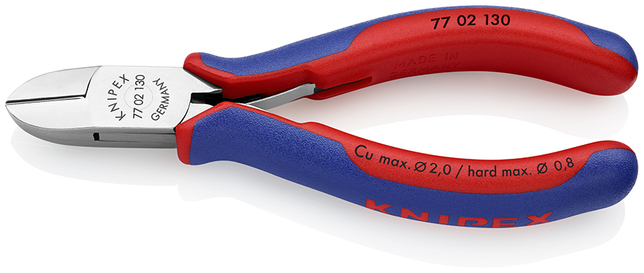 77 02 130 SB bočné cvikacie kliešte pre elektroniku . Úzka izolácia rukoväte potiahnutá až k hlave klieští umožňuje bezpečné a pohodlné držanie náradia, tiež medzi palcom a ukazovákom. Menej fyzickej námahy vďaka veľmi vysokému prevodovému pomeru. Optimalizované na zaťaženie pre bezprostrednejší pocit pri práci. Dvojitá pružina s nízkym trením pre jemné a rovnomerné roztváranie. Zrkadlové leštenie spolu s jemným olejovým filmom ponúkajú účinnú ochranu proti hrdzi – žiadne skraty spôsobené odlupovaním chrómu z pochrómovaného náradia. Nože dodatočne kalené laserom; tvrdosť noža minimálne 60 HRC. okrúhla hlava, s malým úkosom. - Kapacity strihania stredne tvrdého drôtu (priemer): Ø 1,5mm - Kapacity strihania mäkkého drôtu (priemer): Ø 0,8mm - Kapacity strihania mäkkého drôtu (priemer): Ø 0,3 – 2mm - Dĺžka čeľustí (B): 18mm - Hrúbka čeľustí (spoj) (D): 9,5mm - Šírka hlavy (A): 13mm - Dĺžka reznej hrany v mm (C): 16,2mm