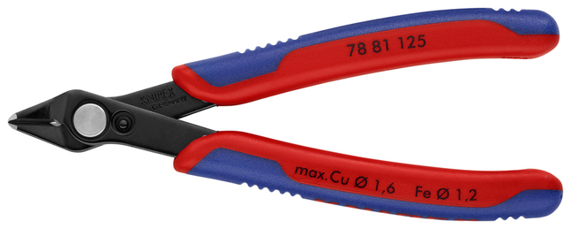 78 81 125 SB Electronic Super Knips® Presné kliešte na ultra jemné strihanie, napr. v elektronike a presnej mechanike. Presne tvarované špičky režú káble blízko povrchu od Ø 0,2 mm. Nožnice režú s kontrolovaným minimálnym vyosením reznej hrany pre najprecíznejšie rezanie aj tých najtenších drôtov a dlhú životnosť. Kĺb s nitom z nerezovej ocele. Extrémne hladký pohyb pre minimálnu únavu pracovníka. S otváracou pružinou a obmedzovačom roztvorenia. precízne vybrúsené rezné hrany s veľmi malým úkosom vhodné tiež pre tvrdý drôt. rezné hrany dodatočne indukčne kalené; tvrdosť reznej hrany pribl. 62 HRC. špeciálna nástrojová oceľ, leštená. - Kapacity strihania stredne tvrdého drôtu (priemer): Ø 1,2mm - Kapacity strihania mäkkého drôtu (priemer): Ø 0,6mm - Kapacity strihania mäkkého drôtu (priemer): Ø 0,2 – 1,6mm - Dĺžka čeľustí (B): 9mm - Hrúbka čeľustí (spoj) (D): 7,5mm - Šírka hlavy (A): 13,5mm
