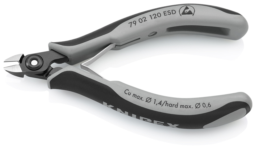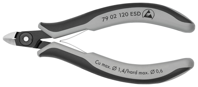 79 02 120 ESD Presné bočné cvikacie kliešte ESD pre elektroniku Presné kliešte na ultra jemné strihanie, napr. v elektronike a presnej mechanike. Rukoväte odvádzajúce statickú elektriku– disipatívne. Veľmi presne vybrúsené a ostré rezné hrany s veľmi malými úkosmi pre presný rez jemných elektronických komponentov; tiež dostupné bez úkosu pre hladký strih. Presné rezné hrany dodatočne indukčne kalené; tvrdosť reznej hrany pribl. 64 HRC. Pribl. 20 % ľahšie než bežné kliešte pre elektroniku. Skrutkový kĺb so starostlivo opracovanými povrchmi kĺbu pre rovnomerný pohyb s nízkym trením počas celého rozsahu otvorenia. Dvojitá pružina s hladkým chodom pre jemné a rovnomerné otvorenie. Ergonomicky optimalizované multi-komponentné rukoväte. mini hlava. - Kapacity strihania stredne tvrdého drôtu (priemer): Ø 1,0mm - Kapacity strihania mäkkého drôtu (priemer): Ø 0,6mm - Kapacity strihania mäkkého drôtu (priemer): Ø 0,2 – 1,4mm - Dĺžka čeľustí (B): 6,5mm - Hrúbka čeľustí (spoj) (D): 6,5mm - Šírka hlavy (A): 9mm - :