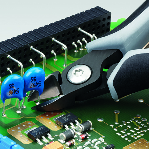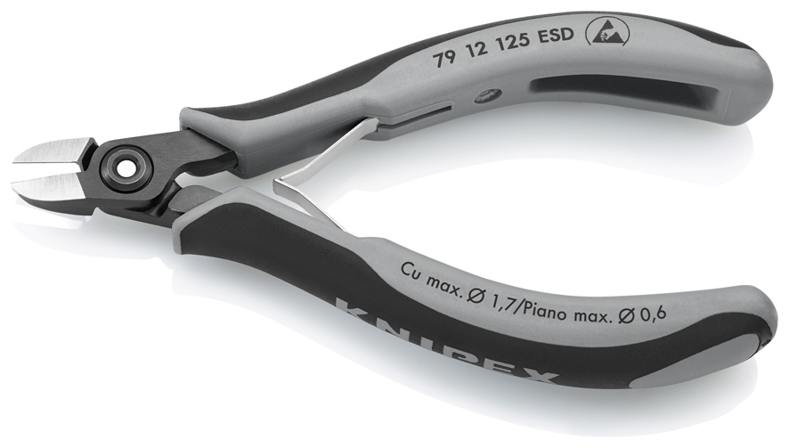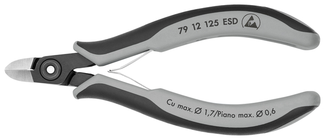 79 12 125 ESD Presné bočné cvikacie kliešte ESD pre elektroniku Presné kliešte na ultra jemné strihanie, napr. v elektronike a presnej mechanike. Rukoväte odvádzajúce statickú elektriku– disipatívne. Veľmi presne vybrúsené a ostré rezné hrany s veľmi malými úkosmi pre presný rez jemných elektronických komponentov; tiež dostupné bez úkosu pre hladký strih. Presné rezné hrany dodatočne indukčne kalené; tvrdosť reznej hrany pribl. 64 HRC. Pribl. 20 % ľahšie než bežné kliešte pre elektroniku. Skrutkový kĺb so starostlivo opracovanými povrchmi kĺbu pre rovnomerný pohyb s nízkym trením počas celého rozsahu otvorenia. Dvojitá pružina s hladkým chodom pre jemné a rovnomerné otvorenie. Ergonomicky optimalizované multi-komponentné rukoväte. špeciálne na strihanie tvrdého a pružinového drôtu. - Kapacity strihania stredne tvrdého drôtu (priemer): Ø 1,3mm - Kapacity strihania mäkkého drôtu (priemer): Ø 1,0mm - Kapacity strihania pružinového drôtu (priemer): Ø 0,6mm - Kapacity strihania mäkkého drôtu (priemer): Ø 0,3 – 1,7mm - Dĺžka čeľustí (B): 10mm - Hrúbka čeľustí (spoj) (D): 6,5mm - Šírka hlavy (A): 11mm - :