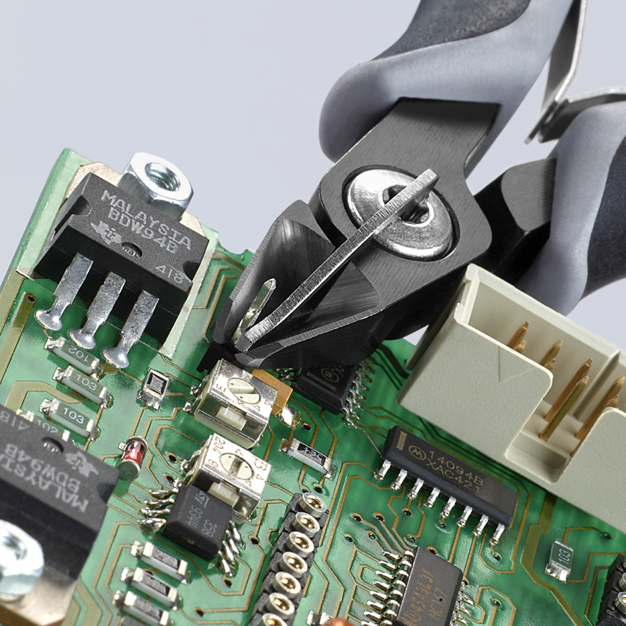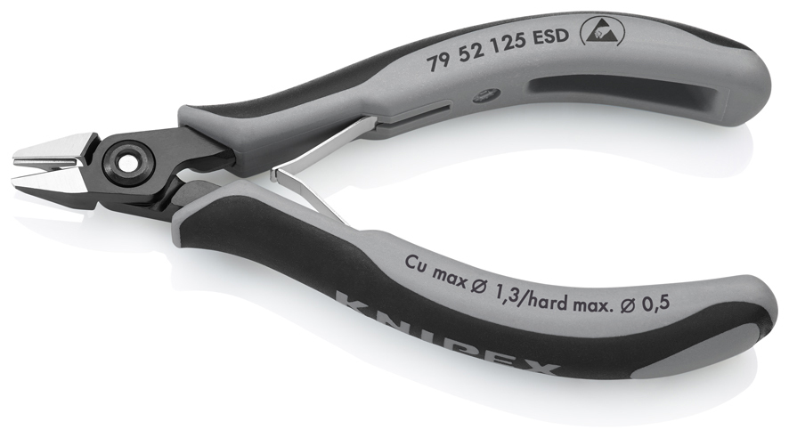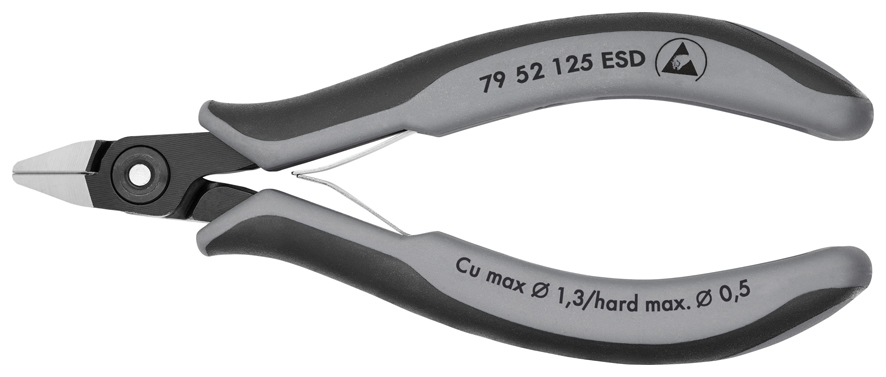 79 52 125 ESD Presné bočné cvikacie kliešte ESD pre elektroniku Presné kliešte na ultra jemné strihanie, napr. v elektronike a presnej mechanike. Rukoväte odvádzajúce statickú elektriku– disipatívne. Veľmi presne vybrúsené a ostré rezné hrany s veľmi malými úkosmi pre presný rez jemných elektronických komponentov; tiež dostupné bez úkosu pre hladký strih. Presné rezné hrany dodatočne indukčne kalené; tvrdosť reznej hrany pribl. 64 HRC. Pribl. 20 % ľahšie než bežné kliešte pre elektroniku. Skrutkový kĺb so starostlivo opracovanými povrchmi kĺbu pre rovnomerný pohyb s nízkym trením počas celého rozsahu otvorenia. Dvojitá pružina s hladkým chodom pre jemné a rovnomerné otvorenie. Ergonomicky optimalizované multi-komponentné rukoväte. špicatá hlava. so zachytávačom odpadu, žiadna nekontrolovaná strata koncov odrezaného kábla. - Kapacity strihania stredne tvrdého drôtu (priemer): Ø 0,9mm - Kapacity strihania mäkkého drôtu (priemer): Ø 0,5mm - Kapacity strihania mäkkého drôtu (priemer): Ø 0,2 – 1,3mm - Dĺžka čeľustí (B): 11mm - Hrúbka čeľustí (spoj) (D): 6,5mm - Šírka hlavy (A): 11mm - :