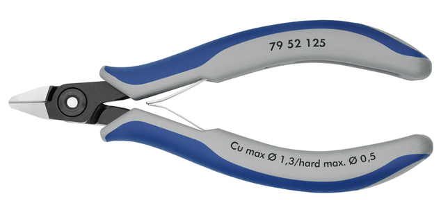 79 52 125 Presné bočné cvikacie kliešte pre elektroniku Presné kliešte na ultra jemné strihanie, napr. v elektronike a presnej mechanike. Veľmi presne vybrúsené a ostré rezné hrany s veľmi malými úkosmi pre presný rez jemných elektronických komponentov; tiež dostupné bez úkosu pre hladký strih. Rezné hrany dodatočne indukčne kalené; tvrdosť reznej hrany pribl. 62 HRC. Pribl. 20 % ľahšie než bežné kliešte pre elektroniku. Skrutkový kĺb so starostlivo opracovanými povrchmi kĺbu pre rovnomerný pohyb s nízkym trením počas celého rozsahu otvorenia. Dvojitá pružina s hladkým chodom pre jemné a rovnomerné otvorenie. Ergonomicky optimalizované multi-komponentné rukoväte. špicatá hlava. so zachytávačom odpadu, žiadna nekontrolovaná strata koncov odrezaného kábla. - Kapacity strihania stredne tvrdého drôtu (priemer): Ø 0,9mm - Kapacity strihania mäkkého drôtu (priemer): Ø 0,5mm - Kapacity strihania mäkkého drôtu (priemer): Ø 0,2 – 1,3mm - Dĺžka čeľustí (B): 11mm - Hrúbka čeľustí (spoj) (D): 6,5mm - Šírka hlavy (A): 11mm
