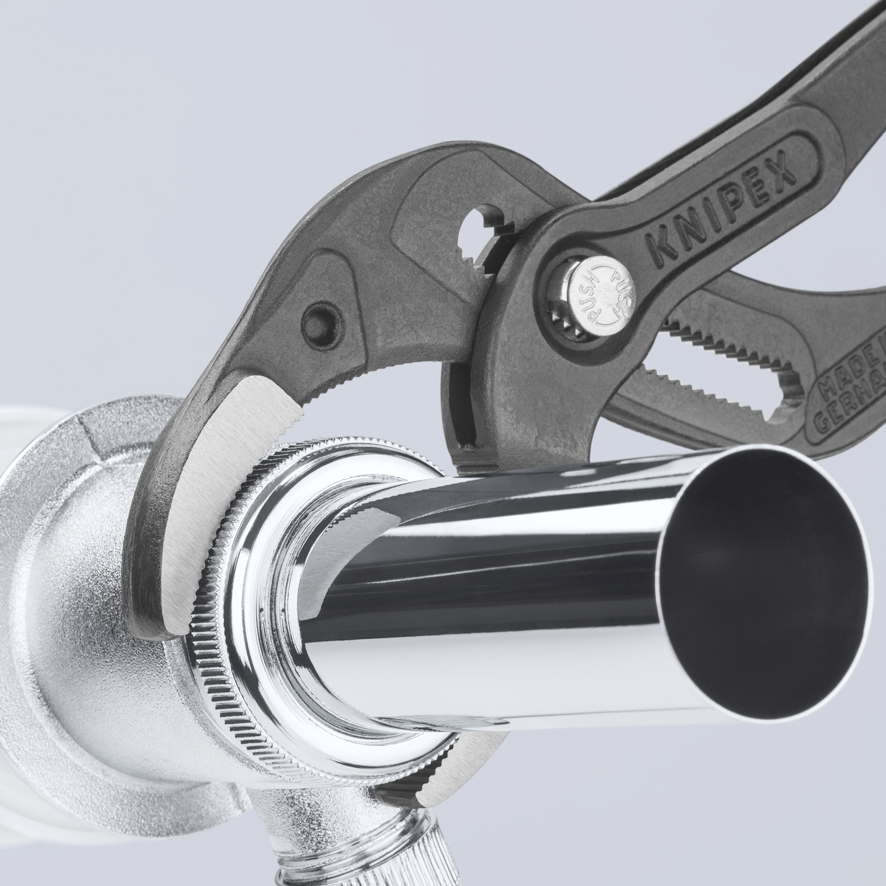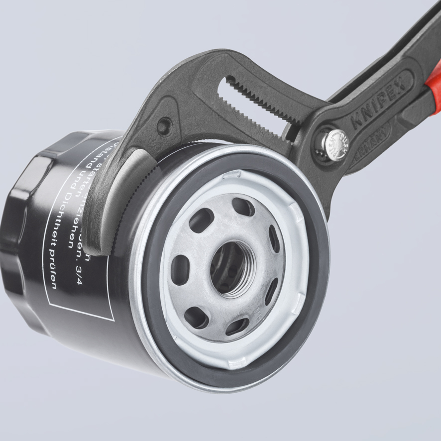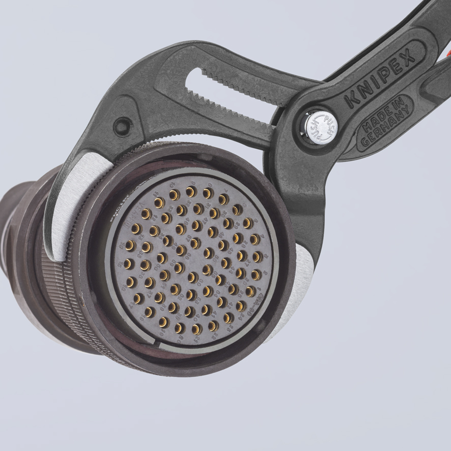 81 01 250 SB Kliešte na sifóny a konektory ideálne na uťahovanie a uvoľňovanie sifónových skrutkových spojov, plastových armatúr a okrúhlych spojkových matíc. Jemné nastavenie pre ideálne prispôsobenie rôznym priemerom. Pre konektory, olejové filtre, plastové potrubia a sifóny. Robustné, vysokozaťažiteľná. Pre konektory a spojky so skrutkovým spojením, ako napr. Cannon okrúhle konektory. Na šetrné uvoľňovanie hadíc na nátrubkoch a filtračných vložiek. Optimálna priľnavosť na čistých povrchoch bez oleja a vazeliny. 25-násobne nastaviteľný prevlečný kĺb. Ergonomická geometria rukoväte. so zúbkovanými úchopovými čeľusťami; až do Ø 80 mm. - : Ø 25 – 80mm - Nastaviteľné polohy: 25