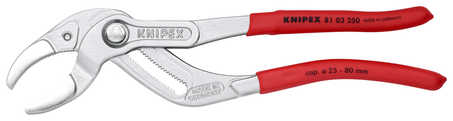 81 03 250 Kliešte na sifóny a konektory ideálne na uťahovanie a uvoľňovanie sifónových skrutkových spojov, plastových armatúr a okrúhlych spojkových matíc. Jemné nastavenie pre ideálne prispôsobenie rôznym priemerom. Pre konektory, olejové filtre, plastové potrubia a sifóny. Robustné, vysokozaťažiteľná. Pre konektory a spojky so skrutkovým spojením, ako napr. Cannon okrúhle konektory. Na šetrné uvoľňovanie hadíc na nátrubkoch a filtračných vložiek. Optimálna priľnavosť na čistých povrchoch bez oleja a vazeliny. 25-násobne nastaviteľný prevlečný kĺb. Ergonomická geometria rukoväte. so zúbkovanými úchopovými čeľusťami; až do Ø 80 mm. - : Ø 25 – 80mm - Nastaviteľné polohy: 25