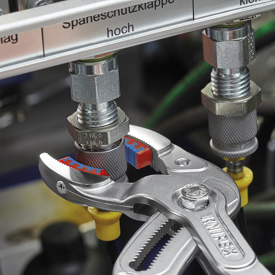 81 13 250 SB Kliešte na sifóny a konektory ideálne na uťahovanie a uvoľňovanie sifónových skrutkových spojov, plastových armatúr a okrúhlych spojkových matíc. Jemné nastavenie pre ideálne prispôsobenie rôznym priemerom. Pre konektory, olejové filtre, plastové potrubia a sifóny. Robustné, vysokozaťažiteľná. Pre konektory a spojky so skrutkovým spojením, ako napr. Cannon okrúhle konektory. Na šetrné uvoľňovanie hadíc na nátrubkoch a filtračných vložiek. Optimálna priľnavosť na čistých povrchoch bez oleja a vazeliny. 25-násobne nastaviteľný prevlečný kĺb. Ergonomická geometria rukoväte. Vymeniteľné úchopové čeľuste s dvojkomponentnou plastovou vložkou s tvrdým nosným komponentom (červený) a mäkkým priľnavým komponentom (modrý). s vymeniteľnými plastovými čeľusťami pre citlivé povrchy; až do Ø 75 mm. - : Ø 10 – 75mm - Nastaviteľné polohy: 25