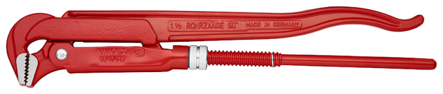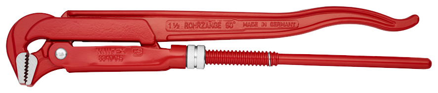 83 10 015 Hasák 90° Švédsky vzor. Čeľuste zahnuté v uhle 90°. čeluste so zubami v opačnom smere. Zuby dodatočne indukčne kalené. Dizajn rukoväte I-beam. Skrytá nastavovacia matica. Popráškované na červeno, čeľuste jasné okrúhle. . - Šírka rozovretia: 60mm - Kapacity použitia na rúrky (priemer): Ø 2 3/8in - Kapacity použitia na rúrky (priemer): Ø 60mm - Kapacity na matice: 60mm - Vnútorný priemer, palce: Ø 1 1/2in