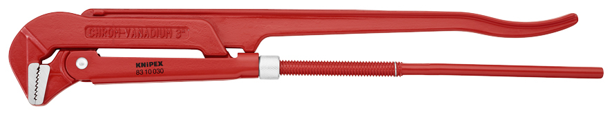 83 10 030 Hasák 90° Švédsky vzor. Čeľuste zahnuté v uhle 90°. čeluste so zubami v opačnom smere. Zuby dodatočne indukčne kalené. Dizajn rukoväte I-beam. Skrytá nastavovacia matica. Popráškované na červeno, čeľuste jasné okrúhle. . - Šírka rozovretia: 110mm - Kapacity použitia na rúrky (priemer): Ø 4 3/8in - Kapacity použitia na rúrky (priemer): Ø 110mm - Kapacity na matice: 105mm - Vnútorný priemer, palce: Ø 3 in