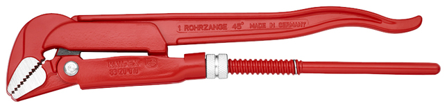 83 20 010 Hasák 45° Švédsky vzor. Čeľuste zahnuté v uhle 45°. čeluste so zubami v opačnom smere. Zuby dodatočne indukčne kalené. Dizajn rukoväte I-beam. Skrytá nastavovacia matica. Popráškované na červeno, čeľuste jasné okrúhle. . - Šírka rozovretia: 42mm - Kapacity použitia na rúrky (priemer): Ø 1 5/8in - Kapacity použitia na rúrky (priemer): Ø 42mm - Kapacity na matice: 42mm - Vnútorný priemer, palce: Ø 1 in