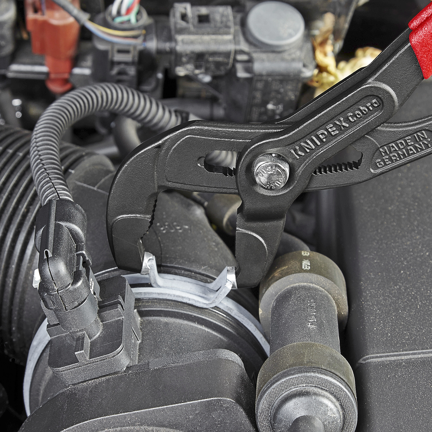 85 51 250 A SB Kliešte na hadicové spony Otočné, univerzálne vložky rukoväte na spoľahlivé uchopenie svoriek vo všetkých polohách. Vložky čeľustí sa tiež môžu otáčať pod zaťažením. Extrémna páková sila, čo umožňuje ľahké otvorenie spôn bez veľkej námahy. štíhly dizajn hlavy; úzka šírka hlavy a otočné úchopové vložky čelustí z nich robia ideálny nástroj, predovšetkým v stiesnených oblastiach. Dodatočná funkcia: jemne odpojí hadice pomocou zúbkovanej čeľuste. rýchlo nastaviteľné: nastavenie posunom priamo na obrobku. Možnosť použitia pre štandardné, úsporné a drôtené spony a krúžky s pružiacimi pásmi do nominálnej veľkosti 70 mm. umožňujú rozsah zovretia vyše 40 mm. - Kapacita: Ø max. 70 mm - Nastaviteľné polohy: 25