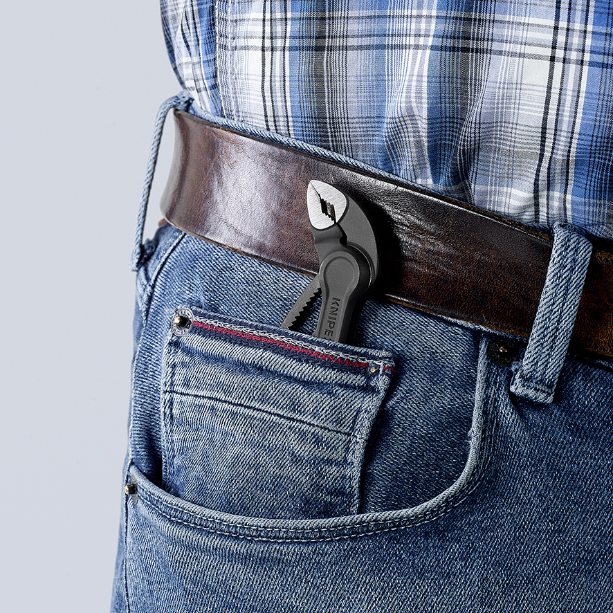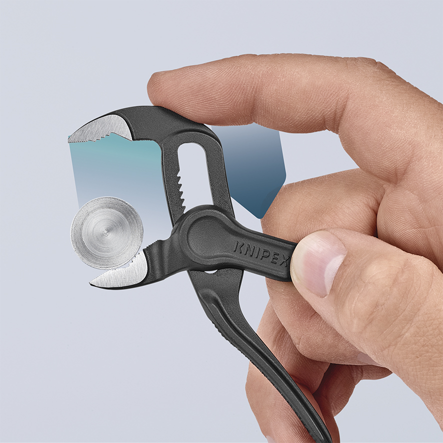 87 00 100 BK KNIPEX Cobra® XS Optimálny prístup do najužších miest: špeciálne kompaktný dizajn s veľmi štíhlou hlavou. Jemné nastavenie jednou rukou posunutím, pre optimálne prispôsobenie pre rôzne veľkosti obrobku. Kapacita uchopenia Ø 28 mm, kapacita pre matice do 24 mm – pri dĺžke iba 100 mm. Prevlečný kĺb: vysoká kvalita a trvácnosť vďaka dvojitému vedeniu. úchopové povrchy so špeciálne tvrdenými zubami, tvrdosť zubov pribl. 61 HRC: vysoká odolnosť voči opotrebovaniu a stabilné uchopenie. Samosvorné na trubkách a maticiach: žiadne vyšmyknutie obrobku a malá potreba ručnej sily. Ochrana pred privretím zabraňuje privretiu prstov pracovníka. Jemné nastavenie s 11 nastaviteľnými polohami. - Nastaviteľné polohy: 11 - Kapacity použitia na rúrky (priemer): Ø 1 in - Kapacity na matice: 24mm - Kapacity použitia na rúrky (priemer): Ø 28mm