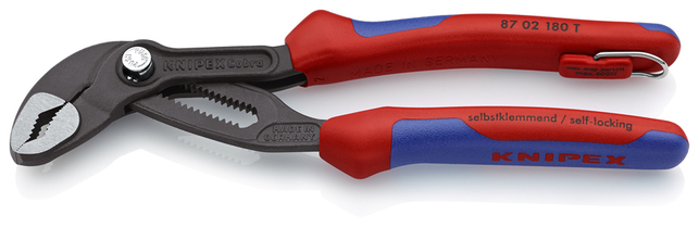87 02 180 T KNIPEX Cobra® Stlačte tlačidlo pre nastavenie na obrobku. Jemné nastavenie pre optimálne prispôsobenie rôznym veľkostiam obrobkov a pohodlnej šírke rukoväte. Samosvorné na trubkách a maticiach: žiadne vyšmyknutie obrobku a malá potreba ručnej sily. úchopové povrchy so špeciálne tvrdenými zubami, tvrdosť zubov pribl. 61 HRC: vysoká odolnosť voči opotrebovaniu a stabilné uchopenie. Dizajn prevlečného kĺbu pre vysokú stabilitu vďaka dvojitému vedeniu. Spoľahlivé zachytenie čapu závesu: žiadne neúmyselné posunutie. Ochrana pred privretím zabraňuje privretiu prstov pracovníka. kliešte so závesným okom na montáž ochrany proti pádu. - Nastaviteľné polohy: 18 - Kapacity použitia na rúrky (priemer): Ø 1 1/2in - Kapacity na matice: 36mm - Kapacity použitia na rúrky (priemer): Ø 42mm - :