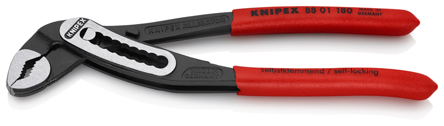 88 01 180 SB KNIPEX Alligator® dobrý prístup k obrobku vďaka štíhlej hlavovej a kĺbovej oblasti. väčší výkon a pohodlie v porovnaní s bežnými kliešťami na vodné čerpadlá rovnakej dĺžky: 9-zárezové nastavenie polohovania pre 30 % väčšiu kapacitu uchopenia. Samosvorné na trubkách a maticiach: žiadne vyšmyknutie obrobku a malá potreba ručnej sily. úchopové povrchy so špeciálne tvrdenými zubami, tvrdosť zubov pribl. 61 HRC: vysoká odolnosť voči opotrebovaniu a stabilné uchopenie. Dizajn prevlečného kĺbu pre vysokú stabilitu vďaka dvojitému vedeniu. Robustná konštrukcia, špineodolná; mimoriadne vhodné na prácu vonku. Ochrana pred privretím zabraňuje privretiu prstov pracovníka. - Nastaviteľné polohy: 9 - Kapacity použitia na rúrky (priemer): Ø 1 1/2in - Kapacity na matice: 36mm - Kapacity použitia na rúrky (priemer): Ø 42mm