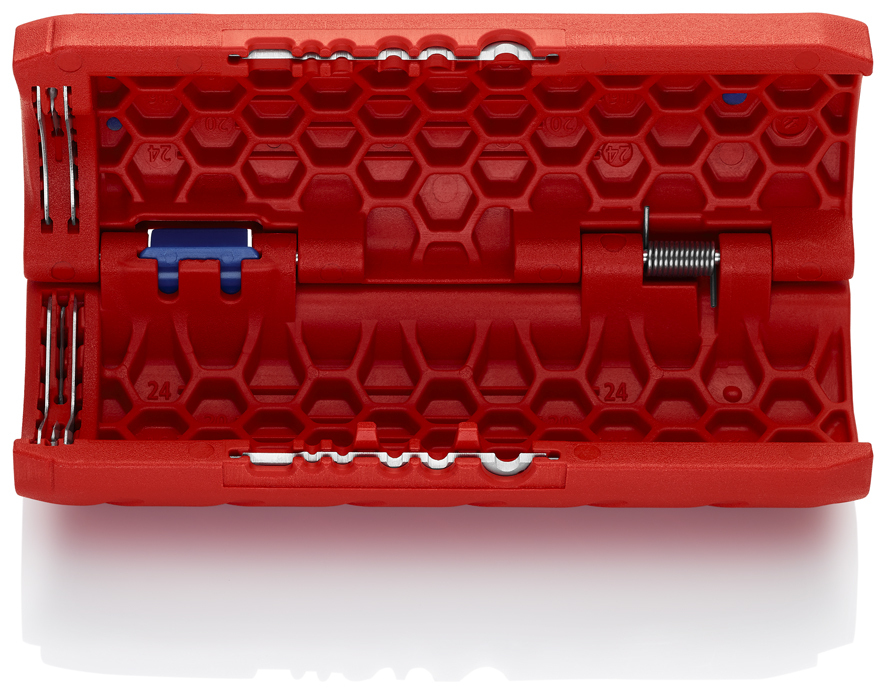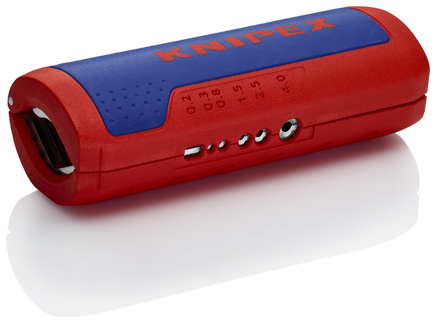 90 22 02 SB KNIPEX TwistCut® na spoľahlivé a rýchle strihanie plastových chráničiek s univerzálnym rozsahom kapacity od Ø 13 do 32 mm. pre vlnité plastové trubky so šírkou hrebeňa až do 2,7 mm. žiadne poškodenie vnútorných káblov alebo trubiek. Oddeľte dokonca mäkšie, flexibilné plastové vlnité trubky: pri rezaní vyvíjajte na nástroj TwistCut® malý tlak, aby ste zabránili deformácii vlnitej trubky. Jednoduché vloženie, spoľahlivé a ľahké rezanie bez odpadu. Presný rez bez poškodenia vďaka jedinečnému usporiadaniu britov s bočným vedením. Dobrá prístupnosť vďaka štíhlemu dizajnu. s odizolovacími čepeľami pre prierezy 0,2 / 0,3 / 0,8 / 1,5 / 2,5 / 4,0 mm². Polohovacie výčnelky (prihlásený patent) na 1,5 a 2,5 mm² odizolovacích čelustiach pre rýchle vloženie kábla. Vnútorná dĺžková stupnica pre rovnaké odizolovanie kábla, čiatateľná pre pravákov aj ľavákov. - : Ø 13 – 32mm - : 0,2 – 4mm²