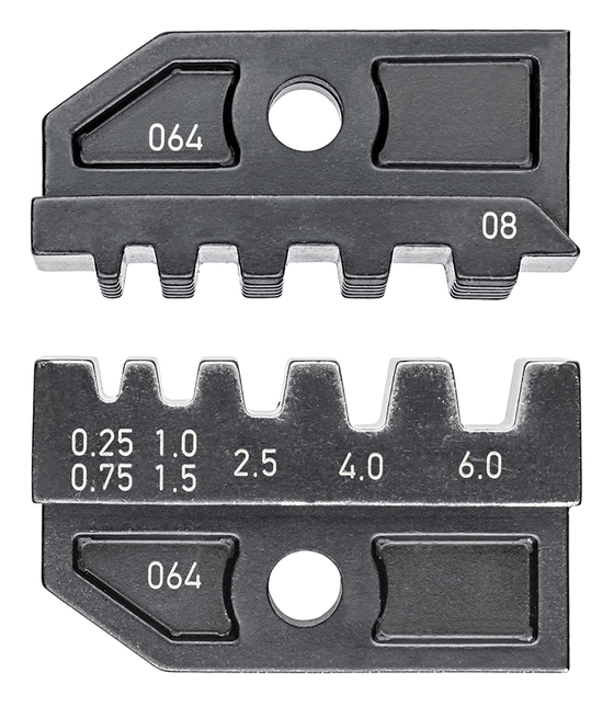 97 49 08 Lisovacie čeluste . Aplikácia: izolované + neizolované káblové dutinky. - Aplikácie: izolované a neizolované dutinky - Kapacita v milimetroch štvorcových: 0,25 — 6mm² - Počet lisovacích pozícií: 5 - AWG: 24 — 10