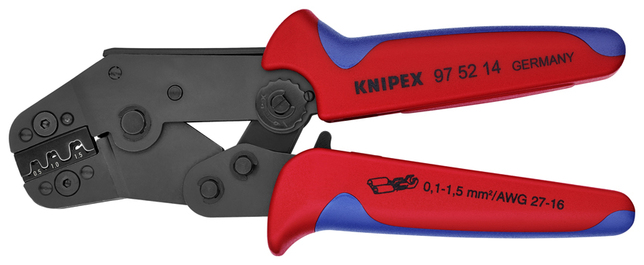 97 52 14 Lisovacie kliešte Trvalo vysoká kvalita lisovania vďaka presným čelustiam a vynútenému blokovaciemu mechanizmu (odblokovateľné). Náradie bolo presne fabricky nastavené (kalibrované). Dobrá manipulácia vďaka hlave zahnutej v uhle 20°, nízkej hmotnosti a krátkemu dizajnu. . dostupné ako príslušenstvo: polohovač pre neizolované otvorené konektory. - Aplikácie: neizolované otvorené konektory (šírka zástrčky 2,8 + 4,8 mm) - Kapacita v milimetroch štvorcových: 0,1 — 1,5mm² - Počet lisovacích pozícií: 4 - AWG: 26 — 16