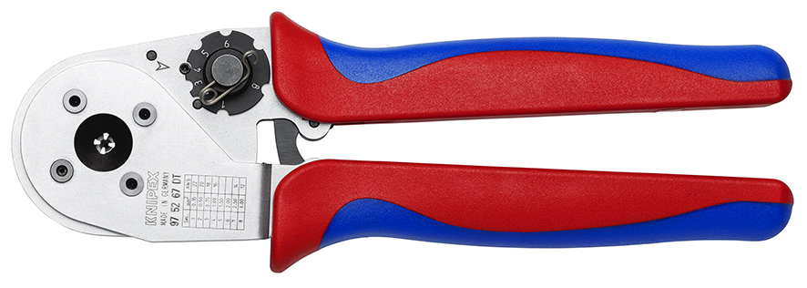 97 52 67 DT . Celková kapacita: od 0,35 mm² do 3,0 mm² (AWG 22-12). . Univerzálna polohovacia pomôcka na flexibilné nastavenie pre všetky dĺžky kontaktov. Opakované, vysoko kvalitné lisovanie vďaka západkovému mechanizmu (odomykateľnému). . Ergonomický dizajn na prácu s malou námahou: optimalizovaná šírka otvoru, pohodlné viaczložkové rukoväte, nízka potreba manuálnej sily vďaka pákovému prevodu. Nie je súčasťou balenia: presne brúsenými meradlami Go/NoGo na kontrolu kalibrácie.