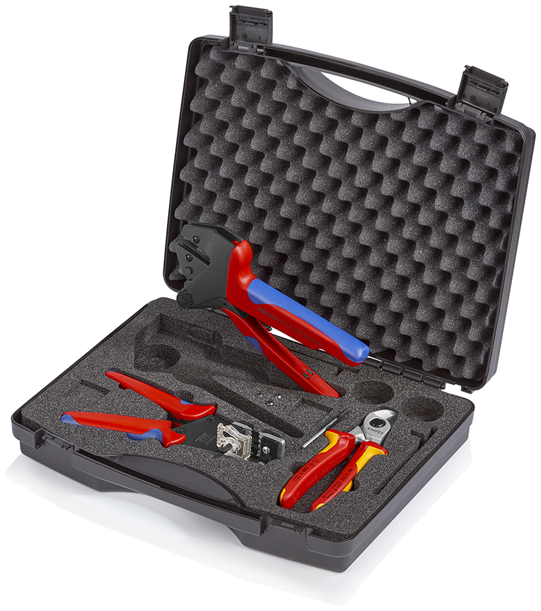 97 91 03 Kufrík na náradie pre fotovoltaiku s náradím pre fotovoltaiku. s presnými odizolovacími kliešťami 12 12 12 s tvarovanými čepeľami pre väčšie hodnoty odizolovania 4,0 / 6,0 / 10,0 mm². s rezačkou 95 16 165 pre medené káble do Ø 15 mm. S krimpovacími kliešťami 97 43 200 A pre vymeniteľné krimpovacie čeluste, krimpovací tlak sa presne nastavuje pri výrobe (kalibruje sa). Bez lisovacích čelustí – prosím objednajte samostatne (pozri ref. 97 49...) pre individuálny sortiment. So servisným náradím (imbusový kľúč) na výmenu lisovacích čelustí. Nárazuvzdorné plastové puzdro. Penová vložka s výklenkami na náradie, lisovacie čeluste (nie je súčasťou dodávky) a polohovače. Rozmery, vonkajšie (Š x V x H): 345 x 80 x 280 mm. Obsah: 1 x 12 12 12 KNIPEX Presný odizolovací nástroj s prispôsobenými čepeľami (4,0 – 10,0 mm²), 1 x 95 16 165 Knipex Nožnice na káble (Ø 15 mm / 50 mm²), 1 x 97 43 200 A KNIPEX Systémové lisovacie kliešte pre vymeniteľné lisovacie čeluste,
