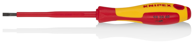 98 20 40 Skrutkovače pre drážkované skrutky Ergonomicky optimalizovaná dvojkomponentná rukoväť pre menej únavnú prácu a optimálny prenos sily. Dizajn rukoväte zabraňuje šmýkaniu. - Dĺžka noža: 100mm - Dĺžka neizolovanej čepele: 15mm - Dĺžka rukoväte: 102mm - Šírka noža: 4,0mm - Hrúbka noža: 0,8mm - :
