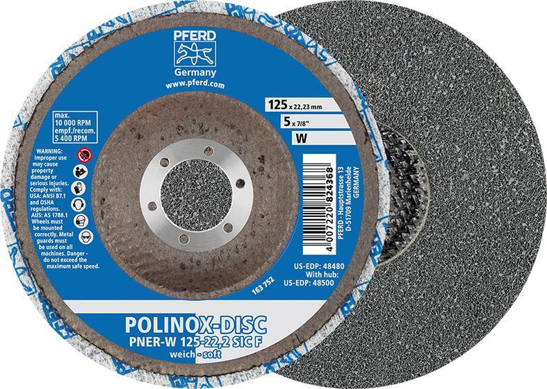 Kompaktný brúsny kotúč POLINOX PNER Vyhotovenie: Plsť, lisovaná do niekoľkých vrstiev, v špeciálnom pojive živice a brúsneho zrna, upevnená na tanieri z tkaniny zo sklenených vlákien. Dobrá životnosť a veľmi vysoká kvalita povrchu. Normovaný otvor 22,23 mm. Použitie: Pre čelné brúsenie. Na vyrovnávanie, jemné dokončovanie, leštenie mäkkých kovov, legovaných a vysoko legovaných oceľí a zliatin titánu. Výrobca: August Rüggeberg GmbH & Co. KG, Hauptstr. 13, 51709 Marienheide, DE, +49226490, pferd@rueggeberg.com