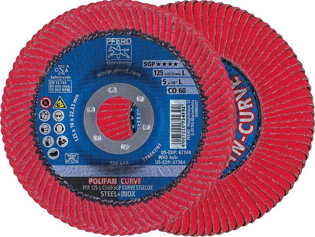 Lamelový brusný kotúč POLIFAN, keramické zrno CURVE CO SGP CURVE STEELOX Vyhotovenie: S keramickým zrnami (CO) a aktívnym brúsnym, chladivým povrchom, v pojive z umelej živice, s vysoko pevným usadením na tanieri zo sklených vlákien. Vysoký výkon úberu pri vynikajúcej životnosti. Lamely sú osadené ako na brúsnej strane, tak aj na zadnej strane lamelového brusného kotúča po celom jeho obvode. Bez obsahu železa, síry a chlóru v pojive. Normovaný otvor 22,23 mm. Použitie: Na dosiahnutie jemných povrchov. Hodí sa špeciálne na obrábanie kútových zvarov, vhodný tiež na zarovnávanie zvarov, zkosovanie hrán a odjehlovanie. Výrobca: August Rüggeberg GmbH & Co. KG, Hauptstr. 13, 51709 Marienheide, DE, +49226490, pferd@rueggeberg.com