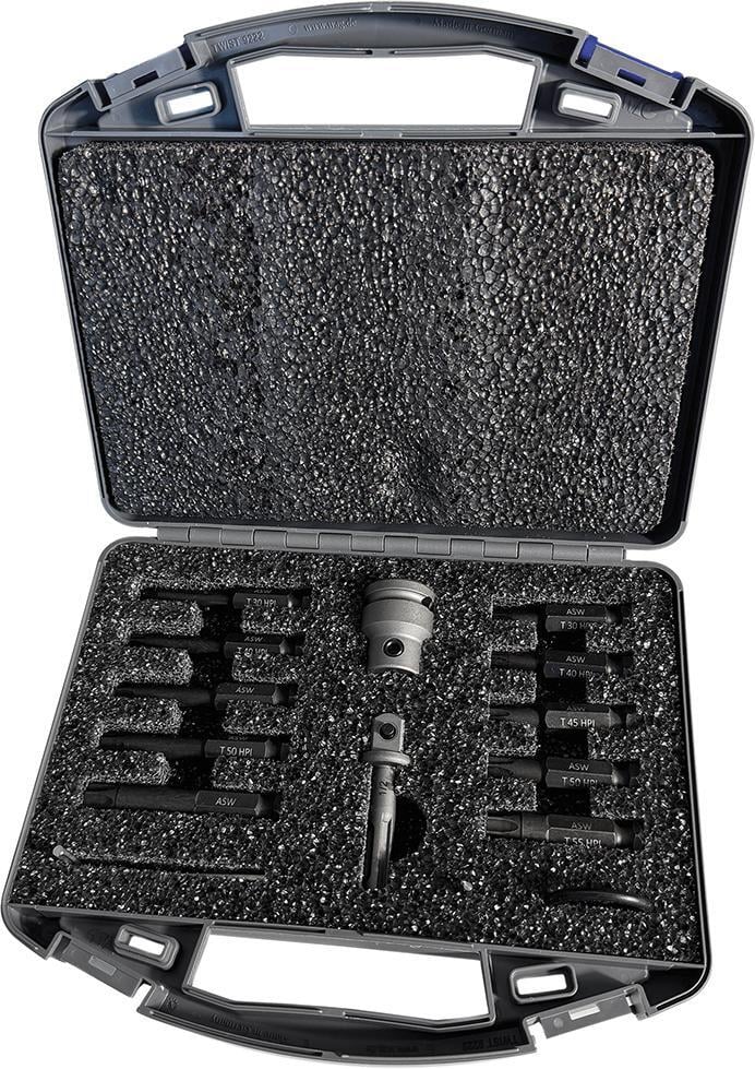 Sada hlavíc silových skrutkovačov, modulárna s 7/16“ bitmi Provedenie: DIN 3126. Z chrómovanej molybdénovej ocele, mangánovo fosfátovaná. Upnutie bitov 7/16“ cez vymeniteľný adaptér 1/2". Jednoduchá a hospodárna výmena hlavice bitu v prípade poškodenia. Dodáva sa v odolnom boxe s penovou vložkou. Výrobca: ASW GmbH & Co. KG, Röntgenstr.10, 57439 Attendorn, DE, +49272293630, info@asw-wekador.de