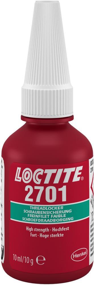 Pojistka šroubov Loctite® 2701 Provedenie: Vysoko pevná pojistka šroubov pre spoje do M20. Sú tolerované drobné olejové znečistenia priemyselnými olejmi. Fluorescenčná pri dopade UV žiarenia pre jednoduchú kontrolu kvality. Použitie: Pre trvalé zabezpečenie a utesnenie kovových závitových spojov proti uvoľneniu a netesnostiam spôsobeným nárazmi a vibráciami. Obzvlášť vhodná aj na chrómované povrchy. Výrobca: Henkel AG & Co. KGaA, Henkel-Teroson-Str.57, 69123 Heidelberg, DE, +4962217040, corporate.communications@henkel.com