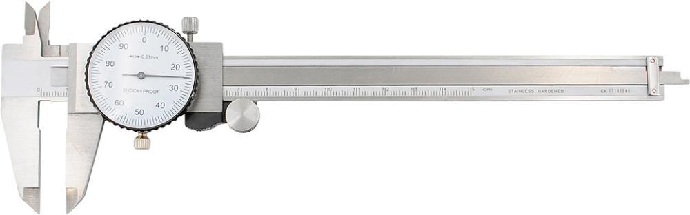 Posuvné meradlo s číselníkovým indikátorom Vyhotovenie: Z nerezovej ocele, tvrdené, stupnica matne chrómaná, ozubená tyč zakrytá, meracie plochy jemne brúsené, s jemným nastavením valčekov, aretačný skrutka a hranatý hĺbkomer. Dodáva sa v drevenom puzdre. Použitie: Na meranie vnútorných, vonkajších, hĺbkových a stupňovitých rozmerov. Výrobca: Einkaufsbüro Deutscher Eisenhändler GmbH, EDE Platz 1, 42389 Wuppertal, DE, +4920260960, webkontakt@ede.de
