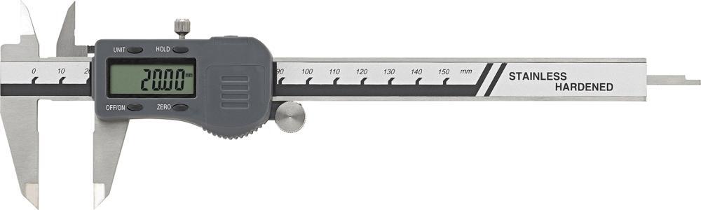 Digitálne posuvné meradlo so skleneným meradlom Vyhotovenie: Z nehrdzavejúcej ocele, jemne brúsené meracie plochy, s aretačným skrutkou a hnacím kolieskom (možno použiť s a bez), výška číslic na LCD displeji 12 mm, s dátovým výstupom RS232. Dodanie s batériou CR2032. Funkcie: Zapínanie a vypínanie, prepínanie mm/palce, reset (vynulovanie) možné v akejkoľvek polohe, funkcia HOLD (pamäť pre ukladanie nameraných hodnôt). Použitie: Na meranie vnútorných, vonkajších, hĺbkových a stupňovitých rozmerov. Výrobca: Einkaufsbüro Deutscher Eisenhändler GmbH, EDE Platz 1, 42389 Wuppertal, DE, +4920260960, webkontakt@ede.de