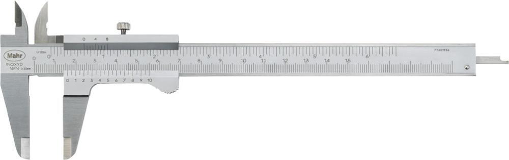 Posuvné meradlo s hranatým hĺbkomerom Vyhotovenie: Z kalenej ocele. Nonius a stupnica lišty matne chrómované, hlavná stupnica mierne zapustená kvôli ochrane proti opotrebovaniu, tabuľka závitov na zadnej strane. Použitie: Na meranie vnútorných, vonkajších, hĺbkových a stupňovitých rozmerov. Výrobca: Mahr GmbH, Carl-Mahr-Str. 1, 37073 Göttingen, DE, +49 551 7073 0, info@mahr.com