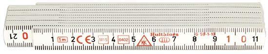 Plastový skládací meter Provedenie: Z ohybného plastu s laminátovou výstuhou, farba biela, čierne razená stupnica v mm na hornej a spodnej hrane článkov. Články sa zacvakávajú v uhle 90°. Presnosť merania podľa ES triedy presnosti III. Výrobca: Hultafors Group Germany GmbH, Luisenstraße, 32052 Herford, DE, +4952289570, info@hultaforsgroup.de