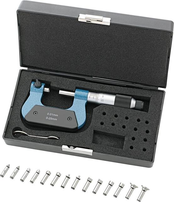 Sada mikrometrov s vymeniteľnými vložkami Prevedenie: Ovládacie prvky a stupnice matne chrómované, oceľový rám, vretienko a kovadlina s otvorom pre vymeniteľné meracie vložky, kalené a brúsené, kalená oceľová guľôčka na dne otvoru pre uloženie stopky meracej vložky, kovadlina nastaviteľná, nerotujúce vretienko, regulácia meracej sily pomocou račňového mechanizmu, s upínacím zariadením. Dodávame s 7 pármi meracích nadstavcov, v puzdre. Výrobca: Einkaufsbüro Deutscher Eisenhändler GmbH, EDE Platz 1, 42389 Wuppertal, DE, +4920260960, webkontakt@ede.de