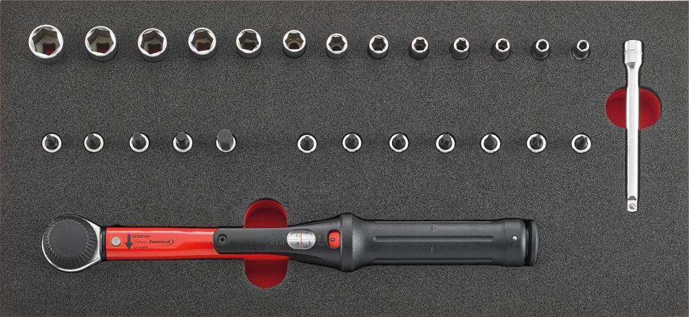 Nástrojový modul momentového kľúča 1/4", 27-dielny, modul 1/3 Provedenie: 2farebná penová vložka, tak bude možné okamžite rozpoznať, že nejaké nástroje chýbajú. 1/9 modul = 188 x 132 mm 2/9 modul = 188 x 264 mm 1/3 modul = 188 x 395 mm 2/3 modul = 376,5 x 395 mm 3/3 modul = 565 x 395 mm Sada nástrčných kľúčov s momentovým kľúčom 1/4", 27 ks 1 momentový kľúč 1/4" 5-25 N·m 13 hlavíc šesťhranných nástrčných kľúčov 1/4“; 4; 4,5; 5; 5,5; 6; 7; 8; 9; 10; 11; 12; 13; 14 mm 5 hlavíc skrutkovača 1/4" vnútorný šesťhran 3; 4; 5; 6; 8 mm 7 adaptér bitov 1/4“ s vnútorným TORX® T10; 15; 20; 25; 27; 30; 40 1 nástavec 1/4" 105 mm Výrobca: Einkaufsbüro Deutscher Eisenhändler GmbH, EDE Platz 1, 42389 Wuppertal, DE, +4920260960, webkontakt@ede.de