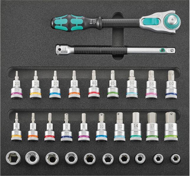 Nástrojový modul nástrčné kľúče 1/2", 31 ks, modul 2/3 Provedenie: 2farebná penová vložka, tak bude možné okamžite rozpoznať, že nejaké nástroje chýbajú. 1/3 modul = 188 x 395 mm 2/3 modul = 376,5 x 395 mm Obsah sady: 1 prepínacia ráčna Zyklop 1/2“ 10 hlavíc šesťhranných nástrčných kľúčov 1/2“ s pridržiavacou funkciou 10; 11; 12; 13; 14; 15; 16; 17; 18; 19 mm 10 adaptér-bitov 1/2" inbus s pridržiavacou funkciou 4; 5; 6; 7; 8; 10; 12; 14; 17; 19 mm 9 adaptér bitov 1/4“ s vnútorným TORX® s pridržiavacou funkciou T 20; 25; 27; 30; 40; 45; 50; 55; 60 1 nástavec Zyklop 1/2" 250 mm Výrobca: Einkaufsbüro Deutscher Eisenhändler GmbH, EDE Platz 1, 42389 Wuppertal, DE, +4920260960, webkontakt@ede.de