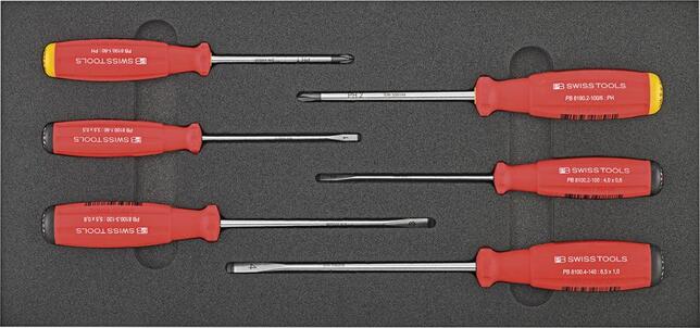Nástrojový modul skrutkovačov, 6-dielny, modul 1/3, PB Swiss Prevedenie: 2farebná penová vložka, tak bude možné okamžite rozpoznať, že nejaké nástroje chýbajú. 1/3 modul = 188 x 395 mm 2/3 modul = 376,5 x 395 mm Obsah sady: 4 skrutkovače pre plochú drážku 3,5; 4; 5,5; 6,5 mm 2 skrutkovače pre krížovú drážku PH 1; 2 Výrobca: PB Swiss Tools AG, Bahnhofstrasse 24, 3457 Wasen/Bern, CH, +41 34 437 71 71, info(at)pbswisstools.com