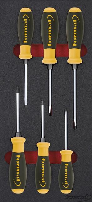 Nástrojový modul skrutkovača s úderovou hlavou, 6-dielny, modul 1/3 Provedenie: 2farebná penová vložka, tak bude možné okamžite rozpoznať, že nejaké nástroje chýbajú. 1/9 modul = 188 x 132 mm 2/9 modul = 188 x 264 mm 1/3 modul = 188 x 395 mm 2/3 modul = 376,5 x 395 mm 3/3 modul = 565 x 395 mm Sada skrutkovačov s krytkou, 6 ks 4 skrutkovače s 2zložkovou plastovou rukoväťou a úderovou hlavou pre plochú drážku 3,5; 4,5; 5,5; 7 mm 2 skrutkovače s 2zložkovou plastovou rukoväťou a úderovou hlavou pre krížovú drážku PH 1; 2 Výrobca: Einkaufsbüro Deutscher Eisenhändler GmbH, EDE Platz 1, 42389 Wuppertal, DE, +4920260960, webkontakt@ede.de