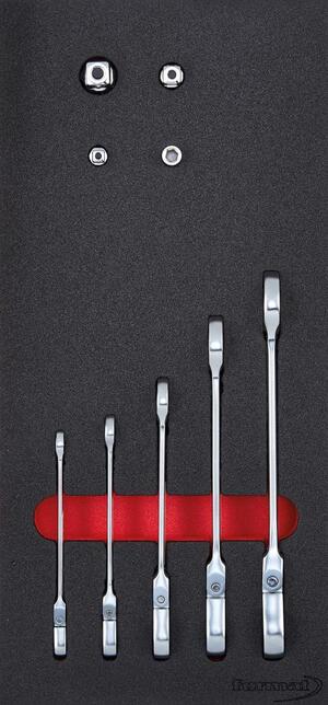 Nástrojový modul vidlicového kľúča s krúžkovou ráčnou, 9-diel., modul 1/3 Provedenie: 2farebná penová vložka, tak bude možné okamžite rozpoznať, že nejaké nástroje chýbajú. 1/9 modul = 188 x 132 mm 2/9 modul = 188 x 264 mm 1/3 modul = 188 x 395 mm 2/3 modul = 376,5 x 395 mm 3/3 modul = 565 x 395 mm Vidlicový kľúč s očkovou ráčnou a kĺbom, 9 ks 5 kĺbových ráčnových kľúčov 8; 10; 13; 17; 19 3 adaptéry nástrčného kľúča 1/4"; 3/8"; 1/2" 1 adaptér pre bity 1/4" Výrobca: Einkaufsbüro Deutscher Eisenhändler GmbH, EDE Platz 1, 42389 Wuppertal, DE, +4920260960, webkontakt@ede.de