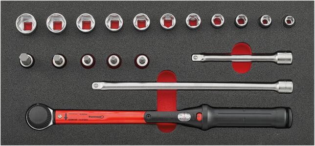 Nástrojový modul momentového kľúča 3/8", 19-dielny, modul 1/3 Provedenie: 2farebná penová vložka, tak bude možné okamžite rozpoznať, že nejaké nástroje chýbajú. 1/9 modul = 188 x 132 mm 2/9 modul = 188 x 264 mm 1/3 modul = 188 x 395 mm 2/3 modul = 376,5 x 395 mm 3/3 modul = 565 x 395 mm Sada nástrčných kľúčov s momentovým kľúčom 3/8", 19 ks 1 momentový kľúč 3/8" 10-50 N·m 11 hlavíc šesťhranných nástrčných kľúčov 3/8“; 8; 9; 10; 11; 13; 14; 15; 16; 17; 18; 19 mm 5 adaptér-bitov 3/8" inbus 4; 5; 6; 8; 10 mm 2 predĺženia 3/8" 125; 250 mm Výrobca: Einkaufsbüro Deutscher Eisenhändler GmbH, EDE Platz 1, 42389 Wuppertal, DE, +4920260960, webkontakt@ede.de