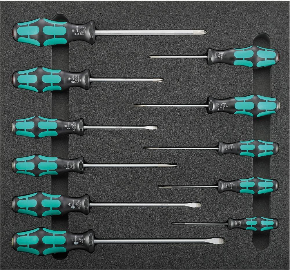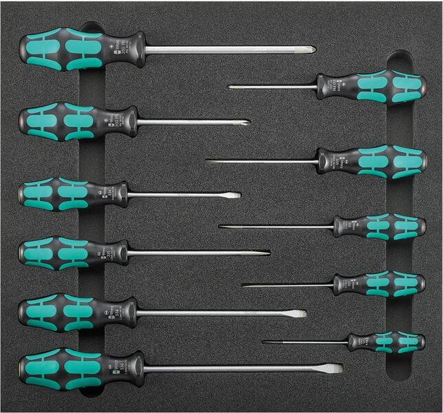 Nástrojový modul skrutkovačov, 11-dielny, modul 2/3 Provedenie: 2farebná penová vložka, tak bude možné okamžite rozpoznať, že nejaké nástroje chýbajú. 1/3 modul = 188 x 395 mm 2/3 modul = 376,5 x 395 mm Obsah sady: 8 plochých skrutkovačov 2,5; 3; 3,5; 4; 5; 5,5; 6,5; 8 mm 3 skrutkovače pre krížovú drážku PH 1; 2; 3 Výrobca: Einkaufsbüro Deutscher Eisenhändler GmbH, EDE Platz 1, 42389 Wuppertal, DE, +4920260960, webkontakt@ede.de