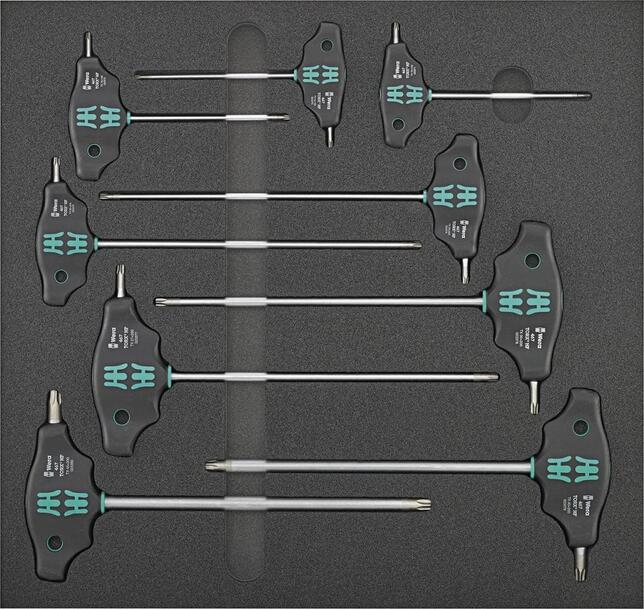 Nástrojový modul priečnej rukoväte vnútorný TORX, 9 kusov, modul 2/3 Vyhotovenie: 2farebná penová vložka, takže bude možné okamžite rozpoznať, že nejaké nástroje chýbajú. 1/3 modul = 188 x 395 mm 2/3 modul = 376,5 x 395 mm Obsah sady: 9 hlavíc skrutkovača s priečnou rukoväťou pre vnútorný TORX® s funkciou uchytenia T 9; 10; 15; 20; 25; 27; 30; 40; 45 Výrobca: Wera Werkzeuge GmbH, Korzerter Str. 21-25, 42349 Wuppertal, DE, +4920240450, sales@wera.de
