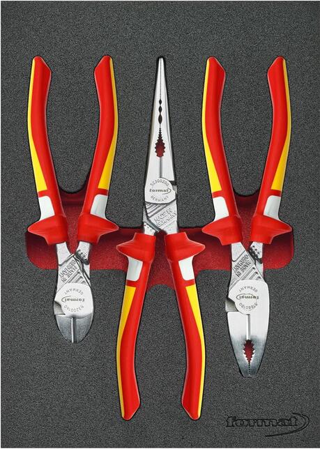Nástrojový modul kliešte VDE, 3-dielny, modul 2/9 Vyhotovenie: 2farebná penová vložka, tak bude možné okamžite rozpoznať, že nejaké nástroje chýbajú. 1/9 modul = 188 x 132 mm 2/9 modul = 188 x 264 mm 1/3 modul = 188 x 395 mm 2/3 modul = 376,5 x 395 mm 3/3 modul = 565 x 395 mm Sada VDE klieští, 3 ks. 1 VDE silové bočné štípacie kliešte, 160 mm 1 VDE silové kombinované kliešte, 180 mm 1 VDE úzke dlhé kliešte, rovné 200 mm Výrobca: Einkaufsbüro Deutscher Eisenhändler GmbH, EDE Platz 1, 42389 Wuppertal, DE, +4920260960, webkontakt@ede.de