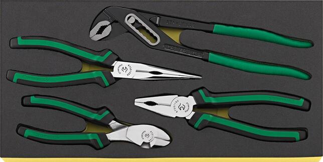 Nástrojový modul kliešte, 4 ks, modul 1/3 Provedenie: 2farebná penová vložka odolná proti chemickým látkam, tak bude možné okamžite rozpoznať, že nejaké nástroje chýbajú. 1/3 modul = 175 x 350 mm 2/3 modul = 350 x 350 mm 3/3 modul = 530 x 350 mm Sortiment náradia v stavebnicovom systéme vložiek na náradie Tool Control System (TCS). Sada klieští, 4 ks 1 kliešte na vodné čerpadlá, 240 mm 1 silové bočné štípacie kliešte, 180 mm 1 ploché okrúhle kliešte, 200 mm 1 kombinované kliešte, 180 mm Výrobca: STAHLWILLE Eduard Wille GmbH & Co. KG, Lindenallee 27, 42349 Wuppertal, DE, +4920247910, info@stahlwille.de