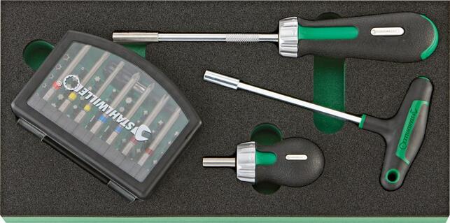 Nástrojový modul bity, 59-dielny, modul 1/3 Provedenie: 2farebná penová vložka odolná proti chemickým látkam, tak bude možné okamžite rozpoznať, že nejaké nástroje chýbajú. 1/3 modul = 175 x 350 mm 2/3 modul = 350 x 350 mm 3/3 modul = 530 x 350 mm Sortiment náradia v stavebnicovom systéme vložiek na náradie Tool Control System (TCS). Sada bitov, 59 ks 2 ráčnové skrutkovače na bity 1/4" 1 držiak bitu 1/4" 1 sada bitov, 56 ks Výrobca: STAHLWILLE Eduard Wille GmbH & Co. KG, Lindenallee 27, 42349 Wuppertal, DE, +4920247910, info@stahlwille.de