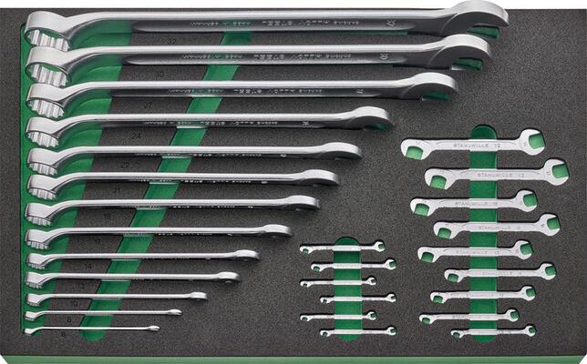 Nástrojový modul kľúče, 28 kusov, modul 2/3 Provedenie: 2farebná penová vložka odolná proti chemickým látkam, tak bude možné okamžite rozpoznať, že nejaké nástroje chýbajú. 1/3 modul = 175 x 350 mm 2/3 modul = 350 x 350 mm 3/3 modul = 530 x 350 mm Sortiment náradia v stavebnicovom systéme vložiek na náradie Tool Control System (TCS). Sada kľúčov, 28 ks 13 krúžkových vidlicových kľúčov 6; 8; 10; 13; 14; 17; 19; 21; 22; 24; 27; 30; 32 mm 15 obojstranných vidlicových kľúčov 3,2; 3,5; 4; 4,5; 5; 5,5; 6; 7; 8; 9; 10; 11; 12; 13; 14 mm Výrobca: STAHLWILLE Eduard Wille GmbH & Co. KG, Lindenallee 27, 42349 Wuppertal, DE, +4920247910, info@stahlwille.de