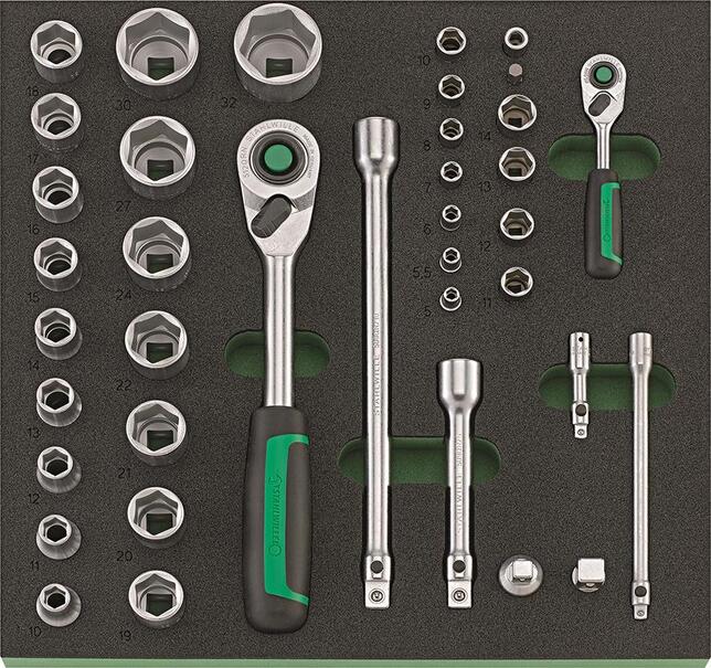 Nástrojový modul nástrčné kľúče, 38-dielny, modul 2/3 Provedenie: 2farebná penová vložka odolná proti chemickým látkam, tak bude možné okamžite rozpoznať, že nejaké nástroje chýbajú. 1/3 modul = 175 x 350 mm 2/3 modul = 350 x 350 mm 3/3 modul = 530 x 350 mm Sortiment náradia v stavebnicovom systéme vložiek na náradie Tool Control System (TCS). Sada nástrčných kľúčov, 38 ks 11 hlavíc šesťhranných nástrčných kľúčov 1/4“; 5; 5,5; 6; 7; 8; 9; 10; 11; 12; 13; 14 mm 17 vložiek šesťhranných nástrčných kľúčov 1/2" 10; 11; 12; 13; 14; 15; 16; 17; 18; 19; 20; 21; 22; 24; 27; 30; 32 mm 2 predĺženia s funkciou QuickRelease 1/4" 54; 150 mm 1 ráčna s prepínacou páčkou s funkciou QuickRelease 1/4" 1 spojovací diel na bity 2 predĺženia s funkciou QuickRelease 1/2" 130; 255 mm 1 ráčna s prepínacou páčkou s funkciou QuickRelease 1/2" 1 adaptér 1/4" na 1/2" 1 redukčná tvarovka 1/2" na 3/8" 1 držiak bitu 1/4" Výrobca: STAHLWILLE Eduard Wille GmbH & Co. KG, Lindenallee 27, 42349 Wuppertal, DE, +4920247910, info@stahlwille.de