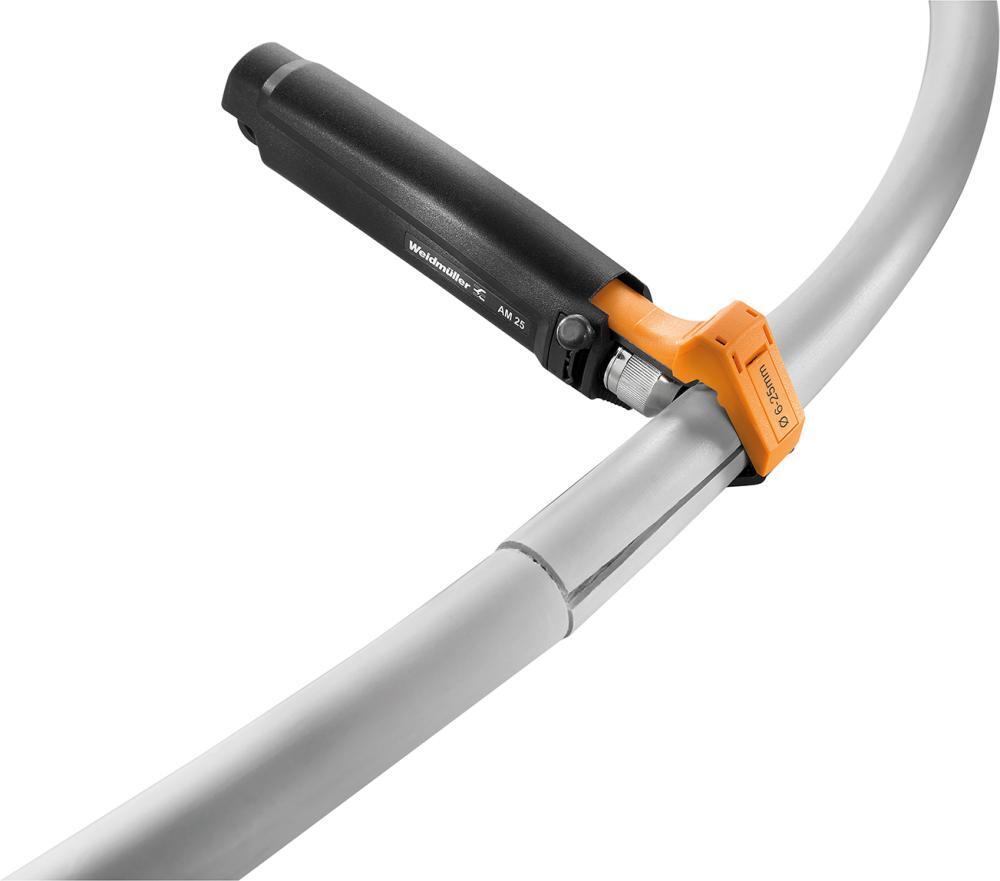Nôž na káble Provedenie: Nôž s uzamykateľným ostrím pre priečne, pozdĺžne a špirálové rezanie s oceľovým držadlom s ostrou hranou na odlúpnutie narezané izolácie. Hĺbku rezu je možné nastaviť ryhovacím skrutkou do hrúbky izolácie 4,5 mm. Rukoväť v plastovom puzdre. Dodávame vrátane 1 náhradného noža v rukoväti. Použitie: Na rýchle odplášťovanie na akomkoľvek mieste kábla s okrúhlym prierezom rôznych veľkostí. Výrobca: Weidmüller GmbH & Co KG, Klingenbergstraße 26, 32758 Detmold, DE, +49 5231 1428 0, weidmueller@weidmueller.de