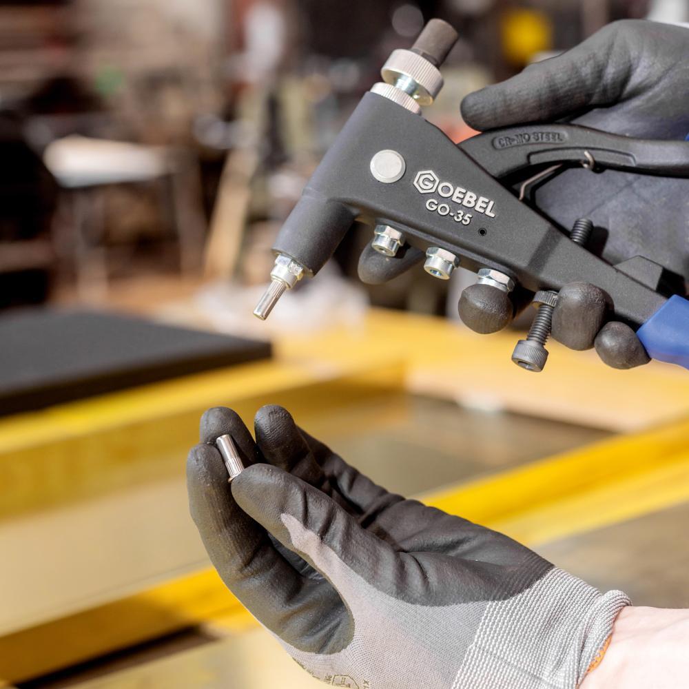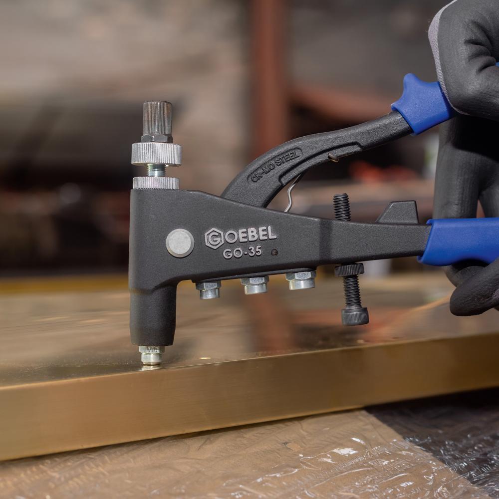 Nýtovacia pištoľ na matice GO -35 Prevedenie: Z kvalitného hliníkového tlakového odliatku s kovanými ramenami klieští z chrómovanej vanádskej ocele. Výmena závitových trňov bez použitia náradia a presné nastavenie zdvihu pre bezpečné a úplné usadzovanie nýtovacích matíc. Okrem toho disponujú ručné nýtovacie kliešte praktickými manžetovými rukoväťami, rozvíraciou pružinou pre jednoduchú manipuláciu. Použitie: Pre nýtovacie matice M3 až M5 akéhokoľvek materiálu a M6 z ocele a hliníka. Obsah dodávky: Ručné kliešte na nýtovacie matice GO-35, 4 špičky M3, M4, M5, M6. Výrobca: Goebel GmbH, Mühlenstr., 40699 Erkrath, DE, +492112450000, info@goebel-group.com