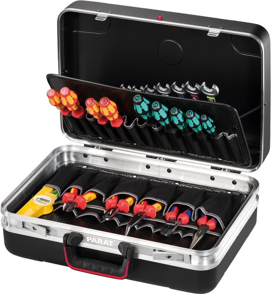 Kufor na náradie SILVER Plus Vyhotovenie: Z robustného, teplotne odolného a nerozbitného plastu X-ABS, čierny, odolného proti poškriabaniu, čierny, s pevným stenami na náradie z materiálu Con-Pearl® pre odolnosť proti poškriabaniu, tvarovú stabilitu a odolnosť proti vlhkosti, tukom a chemikáliám s držiakom krytu a stabilným držadlom. Škrupina dna s výškou 58 mm, voľne rozdeliteľná. S pozinkovanými kovovými kĺbovými pántmi a s hliníkovým obvodovým rámom, zaťažiteľným až do 20 kg. Veľmi stabilný a s ochrannými, integrovanými klzákmi. Zamykateľný 2 klopnými zámkami. Dodáva sa bez obsahu. Vybavenie: 25 zásuvnými priehradkami na doske pre náradie 15 zásuvnými priehradkami na krycej doske 2 svieracími priehradkami na dokumenty 1 škrupinou dna s krycou doskou Výrobca: PARAT Solutions GmbH, Gewerbegebiet Manzing 7, 94065 Waldkirchen, DE, +498581999920, info@parat.de
